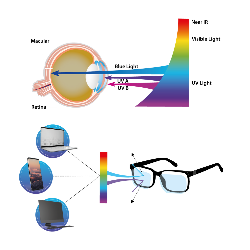 Blue light is everywhere. It is found in the sun’s rays and is emitted from the fluorescent lighting and screens of all electronic devises. The sun contains all colours of light including red, orange, green and blue. Each of these colours emits different energy levels. Red light for example has larger wave lengths and less energy. Blue light and the other end of the spectrum, has shorter wave lengths and more energy. While you get most of your exposure to blue light from the sun when outside, people are now getting more exposure than ever when they’re inside from their screens .Your cornea and eye lens are good at blocking out harmful UV light from reaching the retina, but they cannot block out blue light.